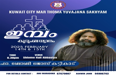 കുടുംബ ധ്യാനം - ഇമ്പം 2025 ഈ വർഷവും ദൈവഹിതമായാൽ ഫെബ്രുവരി മാസം 14, 15 തീയതികളിൽ വൈകുന്നേരം 6.30ന് ശ്ലോമോ ഹാൾ, അബ്ബാസിയയിൽ